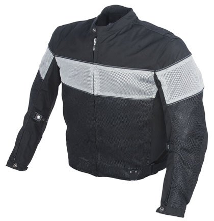 Power Trip Mojave Jacket Resistant RockTex 600 outer shell FreeAir mesh (lower torso) and heavy duty nylon (upper torso and arms) combination Removable 100% waterproof liner C.E. rated protectors in shoulders and elbows Removable spine pad with pocket for optional C.E. protector Ride-friendly pre-curved sleeves SureFit adjustable waist & sleeves Reflective stripe Snap loops securing jacket to belt